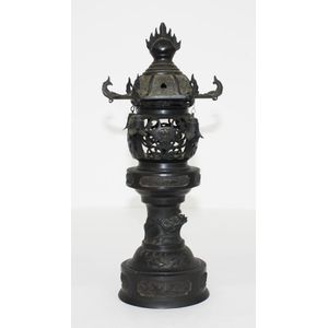 Japanese bronze lantern, in three sections, Meiji period (1868-1912), with bells hanging from the hexagonal top. Height 32 cm overall. Provenance: Rex Jennings Collection